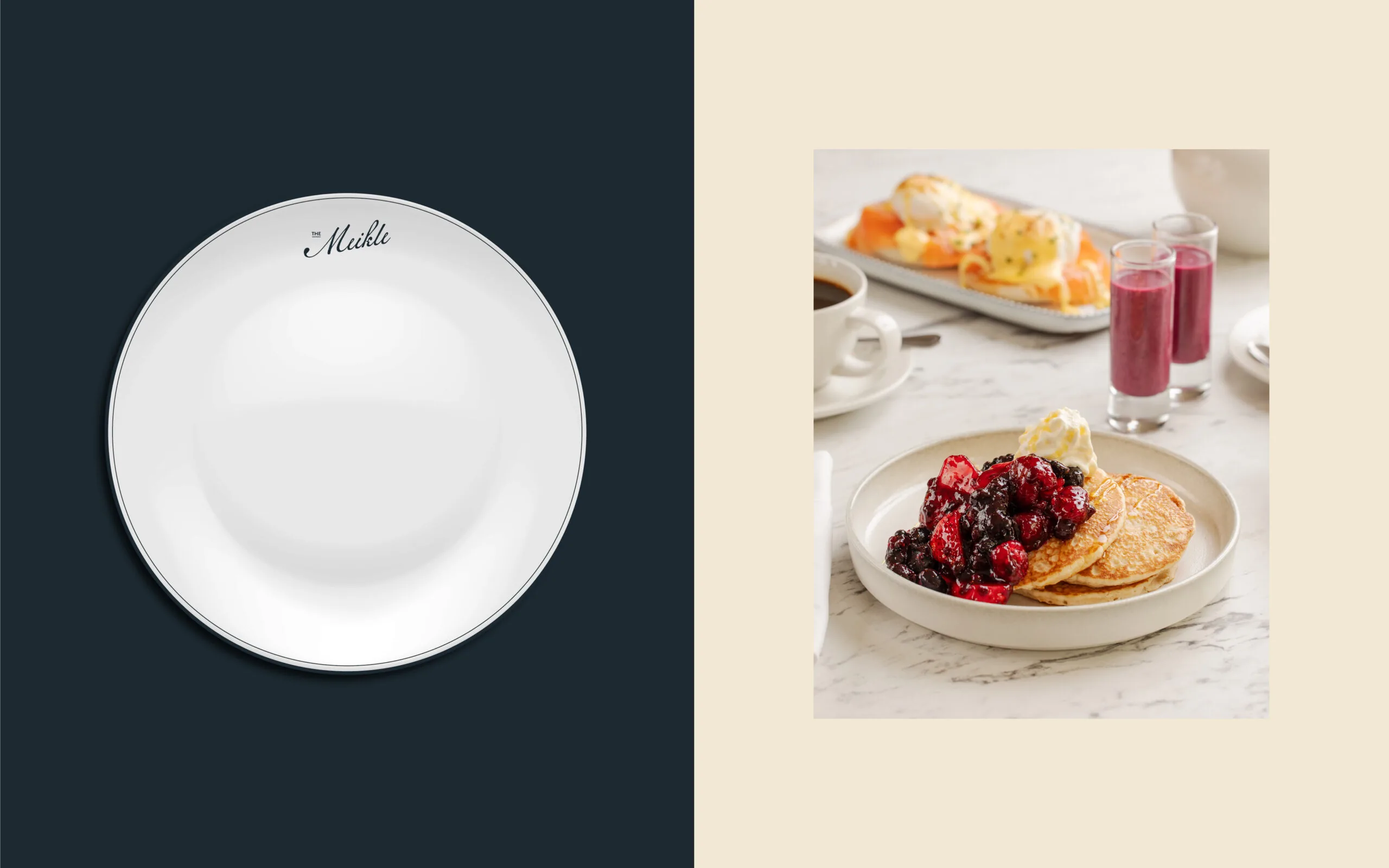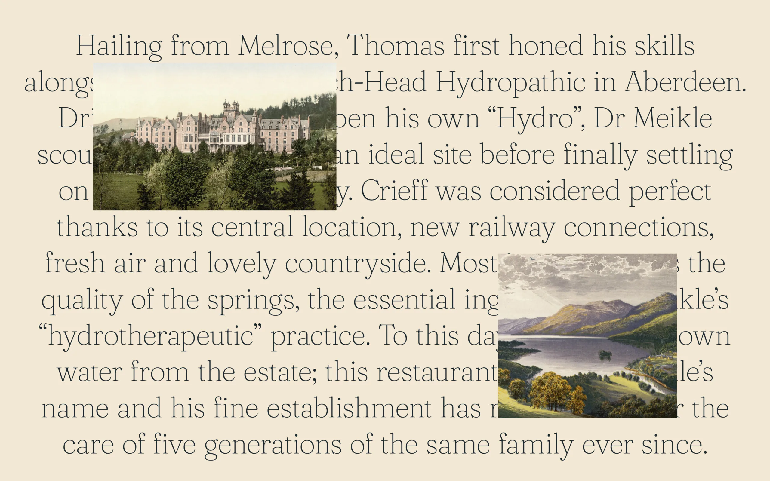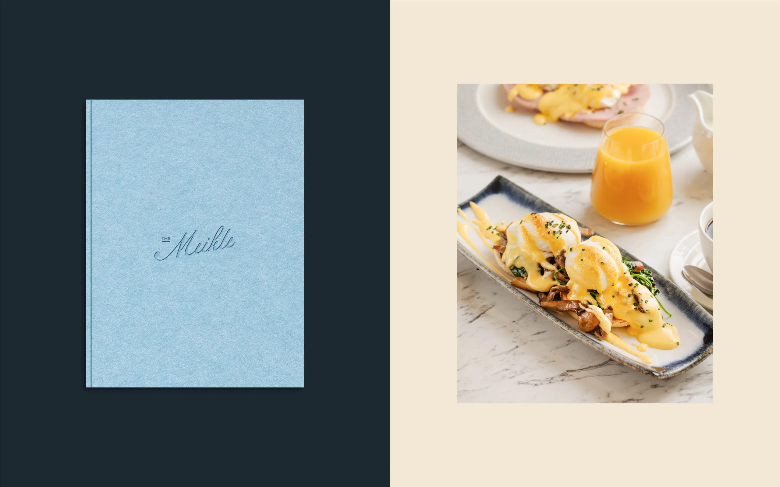 Working closely with the Crieff Hydro project team and their interior partners, we helped bring the vision for the new breakfast space, The Meikle, to life. The concept draws inspiration from a curated collection of historical materials, including Dr. Meikle’s original notes and a range of books and images from the hotel’s archive. The logotype echoes the character of Dr. Meikle’s signature, complemented by typefaces informed by his handwritten and typewritten documents. Our aim was to create a brand that captures a moment in time while presenting it through a contemporary lens, much like the hotel itself so effortlessly achieves.